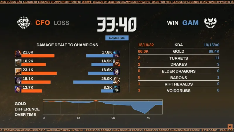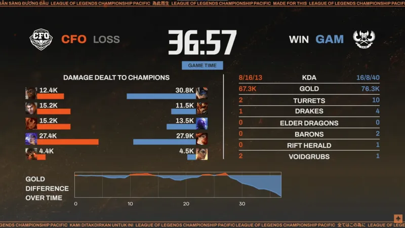 值得一提的是,在第二局比赛中CFO一度落后八千经济的情况下打回局面,但最终被GAM偷家成功输掉比赛。